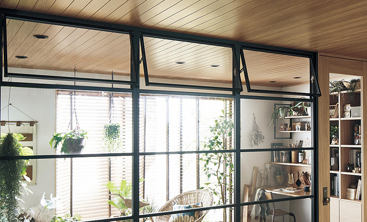 天井まで続く間仕切りの最上部を「突き出し窓」にすることで、外からの気持ちの良い風がリビングまで届くようになります。