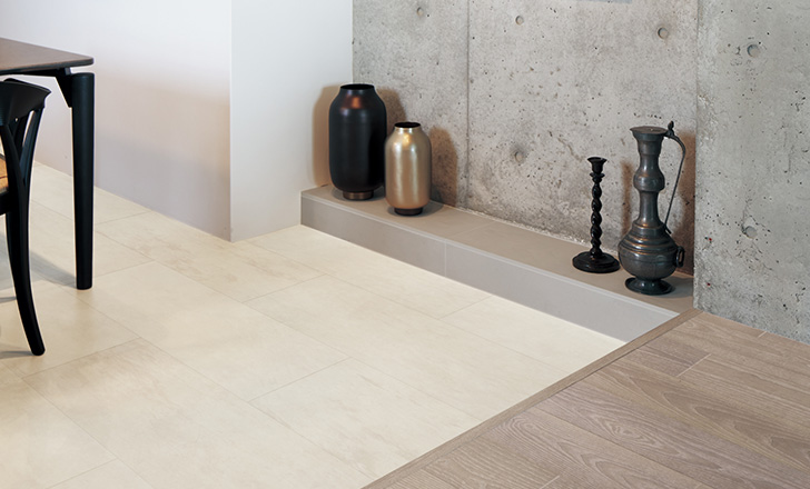 石質素材を活用した床材と、木質素材の床の異素材MIXスタイルは、印象を大きく変えるだけでなく、水にも強いので空間の使い方も大きく変えることができます。