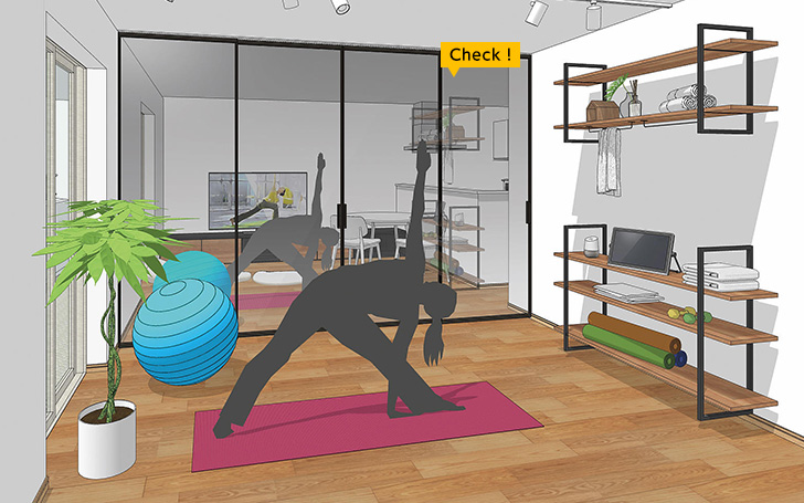必要な時だけ陽だまり空間をつくるなら、フレームの細いガラス引戸が便利です。開けておけば広々リビング、閉めてもフレームが細くノイズが少ないので開放的な空間に。ミラーのように使えるガラスタイプの引戸にすれば、エクササイズなど自分の動きをチェックすることもできます。