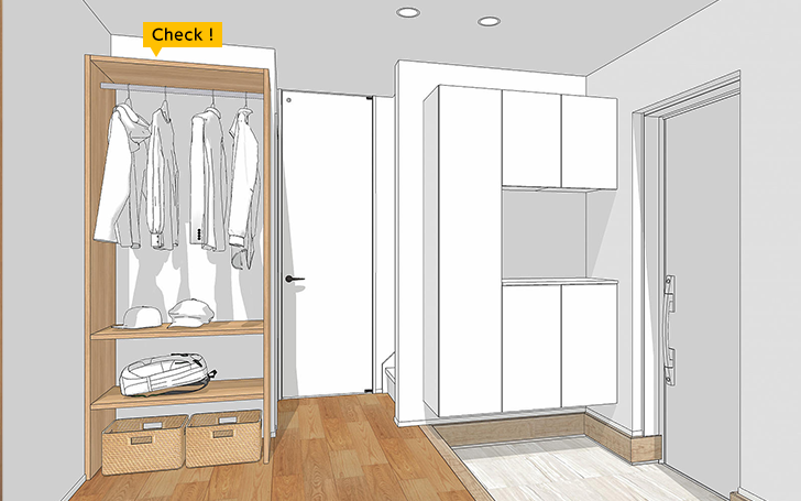 玄関スペースにオープンなミニクローゼットをプラスし、上着やカバンなどをまとめて収納することで、出発前にありがちな“バタバタ”を解消できます。玄関を出てからやっぱり帽子や羽織るものが欲しい……という時にも、部屋の奥まで取りに戻る必要はありません。