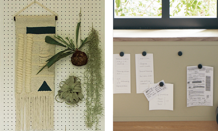 有孔ボードは、玄関のコーディネイトを楽しむ使い方もおすすめ。マグネットボードは、対応する便利グッズが数多くあるので、活用の幅が広いのも魅力です。