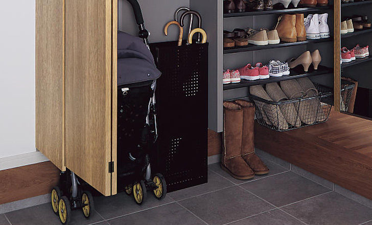 玄関まわりの空間に余裕があるご家庭なら、土間スペースを活用できる玄関収納にすることで、下駄箱には収まらないベビーカーやゴルフバッグなど外での砂汚れが気になる大型荷物を室内に持ち込むことなく収納することができます。収納ドアを閉めれば、スッキリスマートに納まり、持ち出す時もラクラクです。