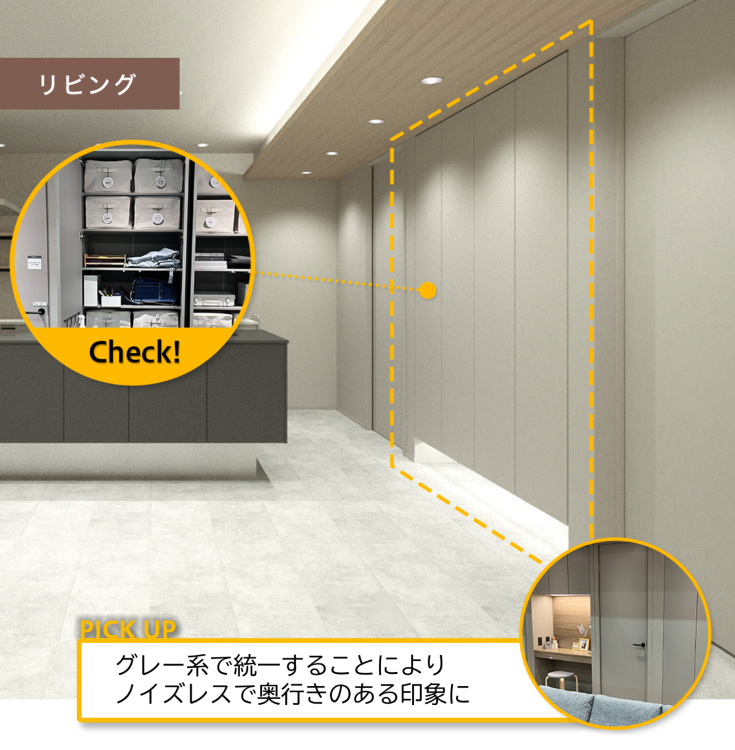 フロート収納をプランできるパナソニックの「#多用途収納 」は、横幅をミリ単位で調整でき、空間にピッタリあわせた設置が可能。収納と内装ドアを「#ベリティス 」の「#パールグレー柄 」で統一すれば、奥行き感のある空間がつくれます。