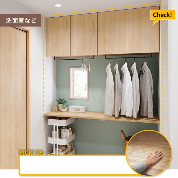 広いスペースが取りづらい洗面室などでも、工夫次第で快適な空間づくりは可能です。たとえば、ハンギングバー付きの吊戸棚をカウンターと組み合わせることで、洗濯物の片付けや洗剤などの詰め替えがサッとこなせる効率的な空間に。