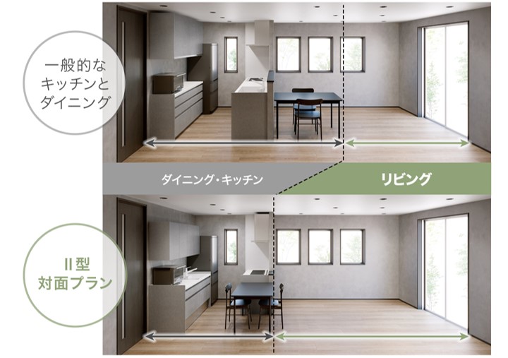 限られたスペースの中で、リビングに広さを確保したいなら、キッチンとダイニングテーブルがセットでレイアウトしやすい「Ⅱ型対面 プラン」がおすすめ。「つくる・たべる・あらう」の三角動線を実現できるので調理から片付けまでの一連の動作もコンパクトに完結。