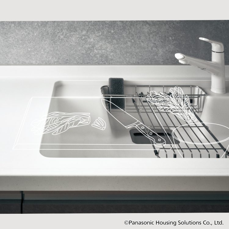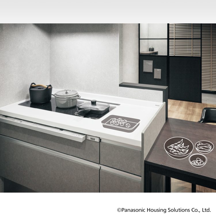 パナソニックの「#Ⅱ型対面プラン 」なら、コンパクトなスペースでも作業性をアップできる『二人並んでも広々使える#ワイドコンロ 』 や『作業スペースを拡張できる#スラくるネット 』など