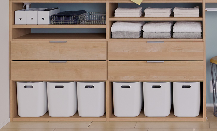 シンプルで使いやすい「無印良品」の収納用品を活用されているご家庭は多いのではないでしょうか。揃えて、まとめて、いつもの収納用品がフィットするモジュールの収納を選べば、空間が驚くほどスッキリ。その際、雑多な印象が少なくなるように「縦・横・高さ」をできるだけ揃えて、「いっしょに使うモノ」はケースやバスケットにまとめて納めることが整った印象づくりのポイントです。