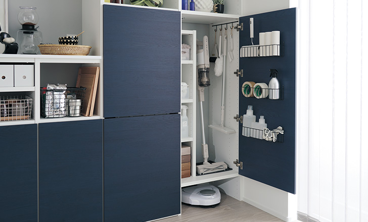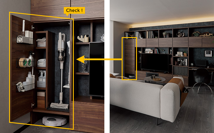 さっとお掃除できるスティック型掃除機など、便利だけど収納しにくいモノって意外と多いですよね。また、リビングで毎日のように使うお掃除グッズも別の部屋に収納してしまうと、片付けなくなってしまったり…。だからこそ、片づけやすい工夫のある収納を使いやすい場所につくることはとても大切です。ロボット掃除機の“居場所”づくりもお忘れなく。