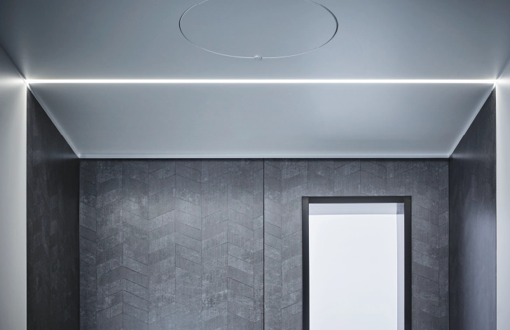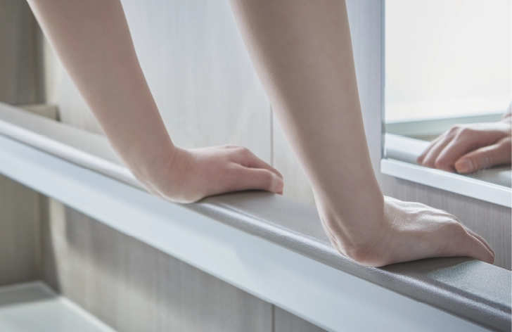 入浴時の足元の“ヒヤリ”を解消でき、「#おきラクスマート手すり 」が立ち座り・浴槽への出入りなどの動作をサポートしてくれます。天井に埋め込まれたフラットなライン状のLED照明が足元や床のスミまで明るく照らしてくれるのもうれしいポイント。