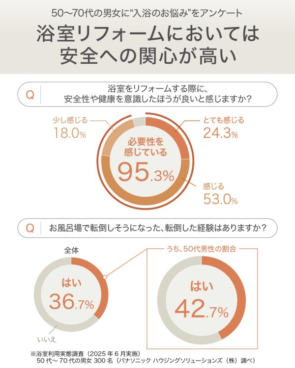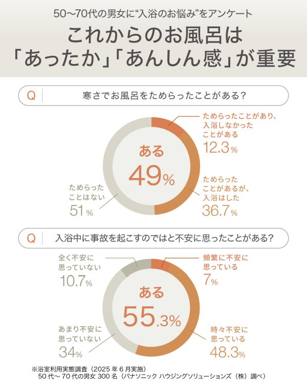 ■パナソニック ハウジングソリューションズ(株)が50代~70代の男女に実施したアンケートによると、約5割もの人が自宅の浴室の“寒さ”と“安全性”に不安を感じているということが明らかに。