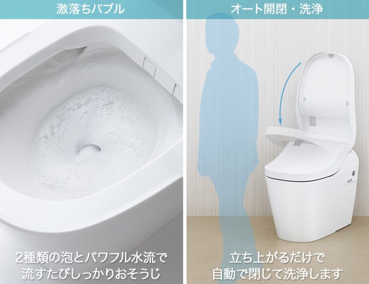 さらに、流すたびに泡で洗う「#バブル洗浄 」や、用を足してトイレを出るまで便器に触らずに済む「#オート開閉 」「#クローズ洗浄 」機能も搭載。ラクにキレイが続く、居心地のよいトイレ空間を実現できます。